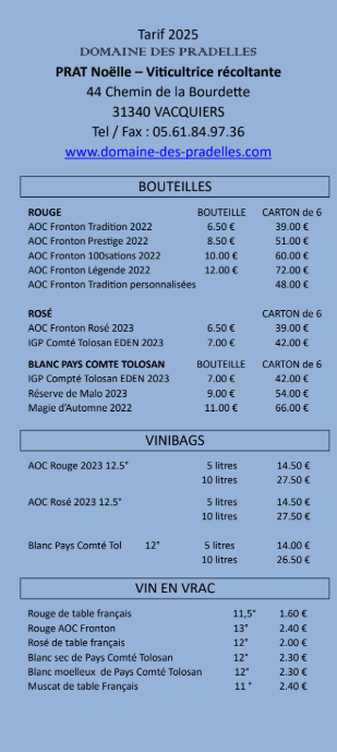 Voici les Tarifs 2024 que nous pratiquons en vente directe au Domaine.